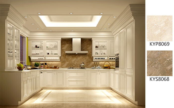 愛丁堡格蘭石KYS8068、KYP8069瓷磚搭配珠光白木讓整個空間幹淨明亮,充滿田園氣息,平開高櫃、玻璃吊櫃、突出了廚房的古典大氣。