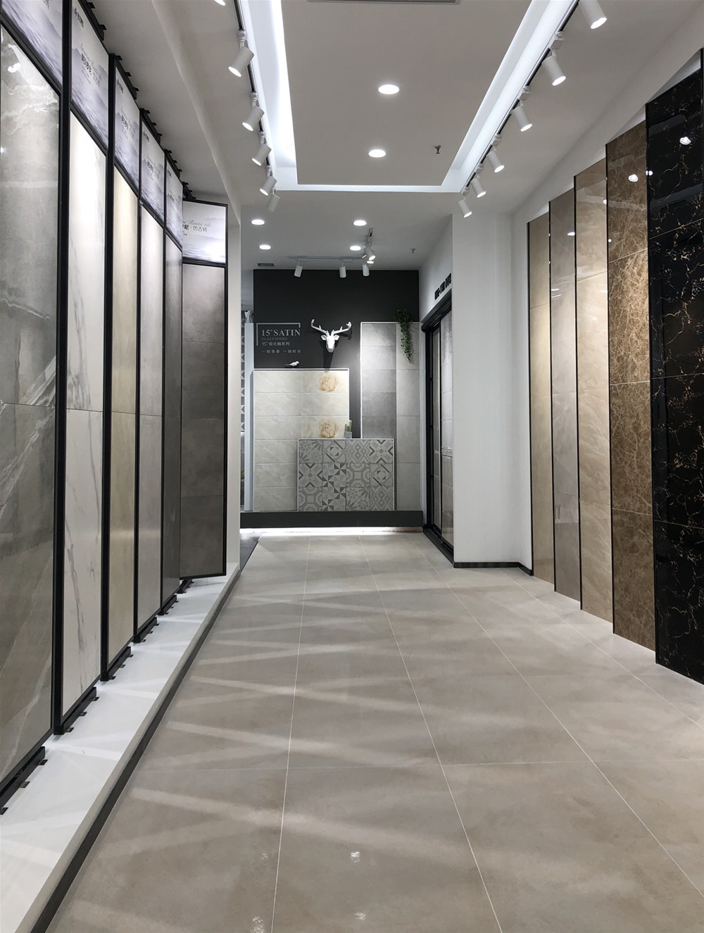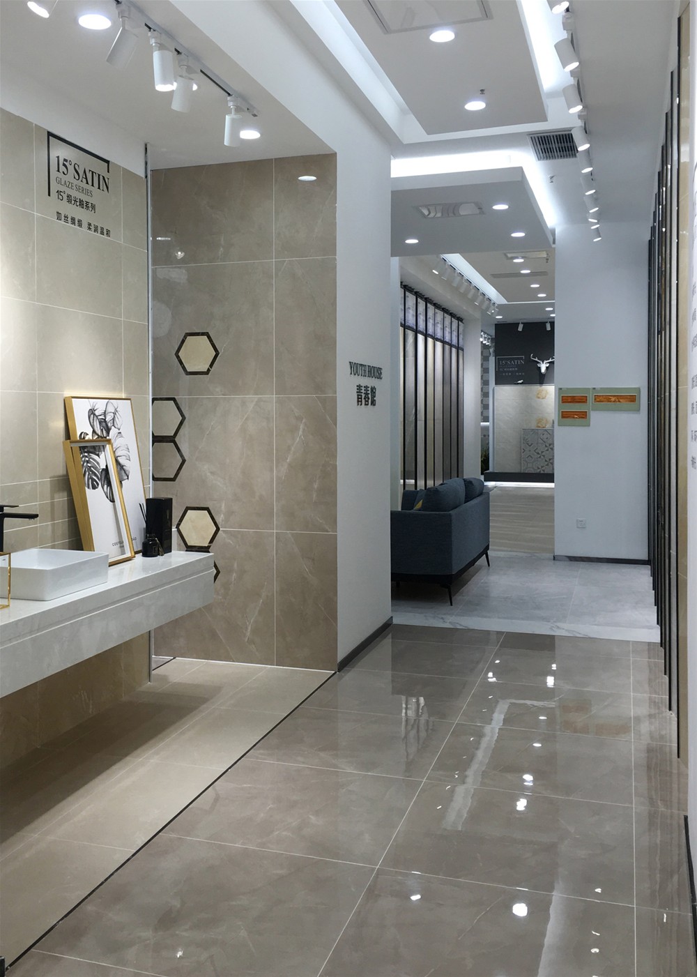 通常選用15°緞光釉、現代仿古磚、九麵通體大理石等多麵紋理變幻不一的瓷磚,簡約卻不單調。